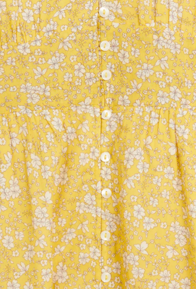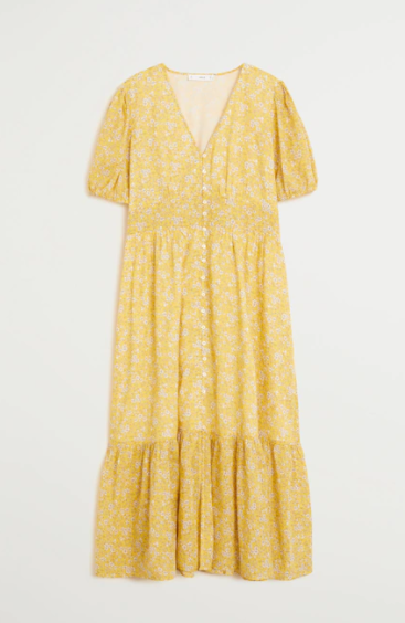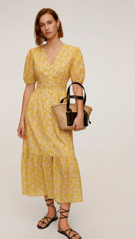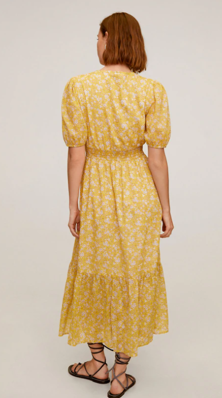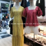 Váy hoa dáng dài, cổ chữ V, tay áo ngắn với cổ tay bo chun co giãn, có cúc cài.